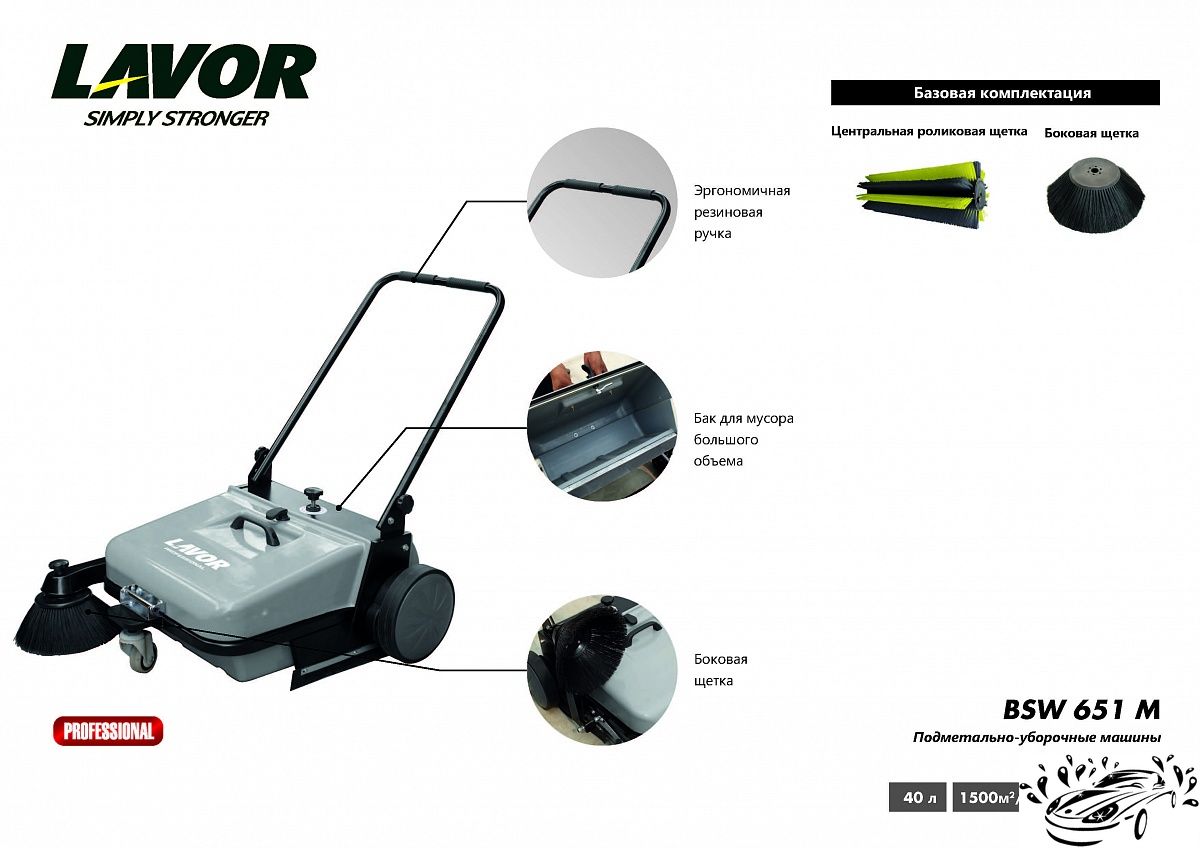 Подметальная машина с механическим приводом Lavor (Лавор) BSW 651 M - производительная подметальная машина с механическим приводом, для уборки прилегающих территорий и внутренних помещений площадью до 3 000 м2.
