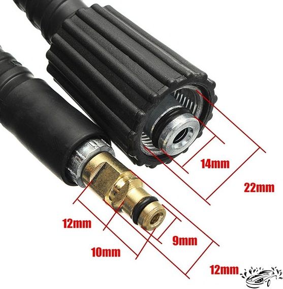 Диаметр этого шланга высокого давления составляет 6 мм, рассчитан именно под давление и производительность бытовых минимоек.