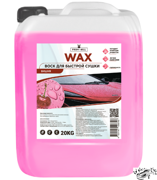 WAX "ВИШНЯ" защищает автомобиль от мелких повреждений и влаги. Обладает высокой водоотталкивающей способностью, ускоряя быстрое высыхание кузова после мытья автомобиля. Придает автомобилю дополнительный блеск, дополнительный защитный слой и антистатичекие свойства лакокрасочному покрытию. Предназначен для разбавления холодной водой.